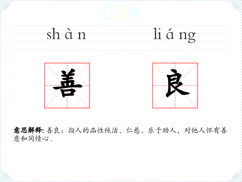 善良:指人的品性纯洁、仁慈、乐于助人,对他人怀有善意和同情心。