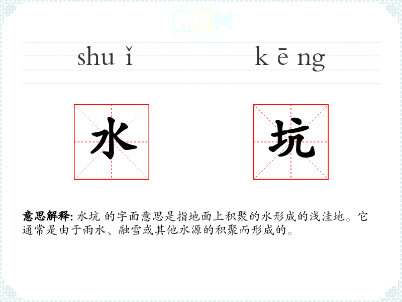水坑 这个词源于汉语,由“水”和“坑”两个字组成。在古代汉语中,“坑”通常指地面的凹陷,与“水”结合后,形成了描述积水的词汇。