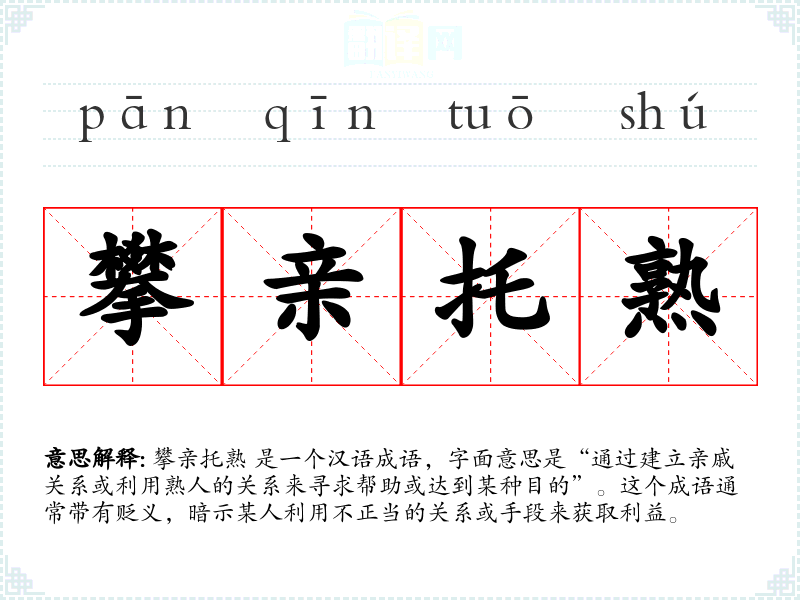 攀亲托熟 是一个汉语成语,字面意思是“通过建立亲戚关系或利用熟人的关系来寻求帮助或达到某种目的”。这个成语通常带有贬义,暗示某人利用不正当的关系或手段来获取利益。