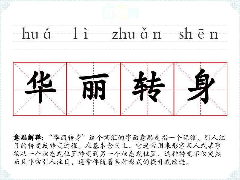 “华丽转身”这个词汇的字面意思是指一个优雅、引人注目的转变或转变过程。在基本含义上,它通常用来形容某人或某事物从一个状态或位置转变到另一个状态或位置,这种转变不仅突然而且非常引人注目,通常伴随着某种形式的提升或改进。