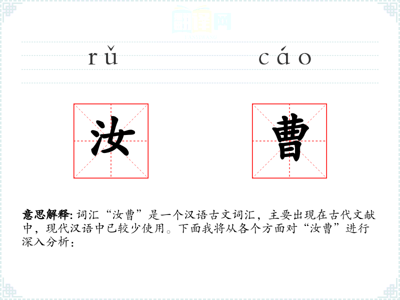 词汇“汝曹”是一个汉语古文词汇,主要出现在古代文献中,现代汉语中已较少使用。下面我将从各个方面对“汝曹”进行深入分析:
