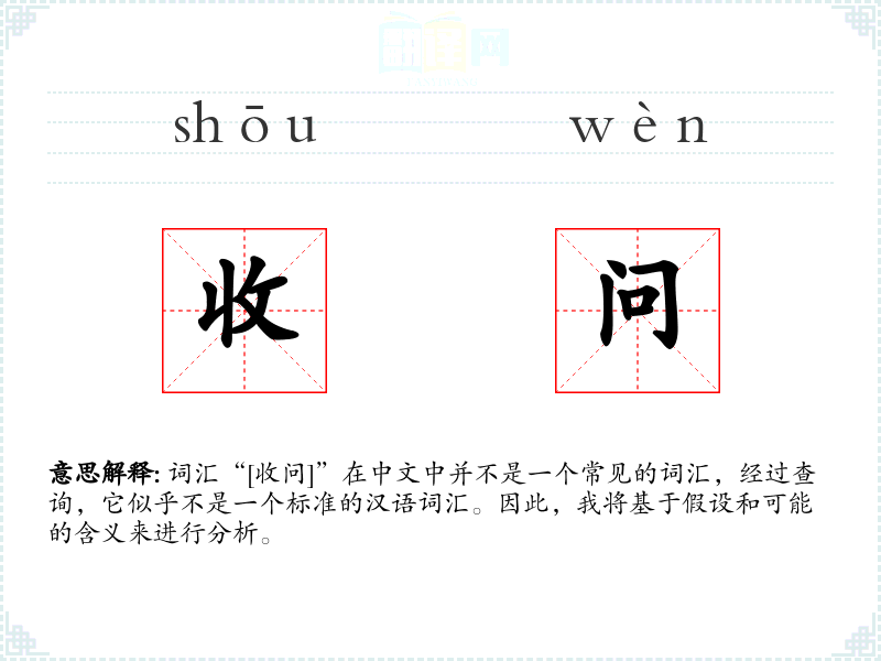 假设“收问”是一个组合词,可能的含义是“接收问题”或“收集问题”。字面意思可以理解为“收取”和“问题”的结合,即主动或被动地接收问题。