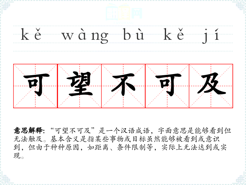 “可望不可及”是一个汉语成语,字面意思是能够看到但无法触及。基本含义是指某些事物或目标虽然能够被看到或意识到,但由于种种原因,如距离、条件限制等,实际上无法达到或实现。