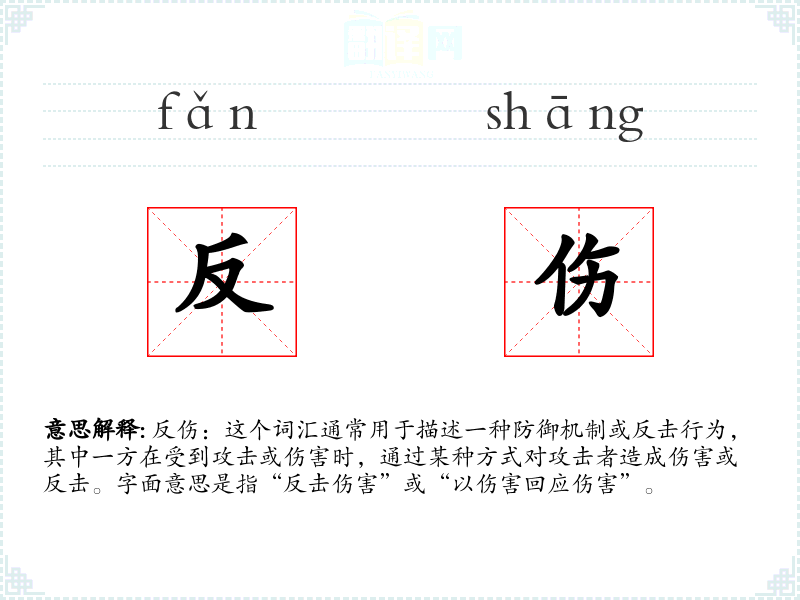 反伤:这个词汇通常用于描述一种防御机制或反击行为,其中一方在受到攻击或伤害时,通过某种方式对攻击者造成伤害或反击。字面意思是指“反击伤害”或“以伤害回应伤害”。