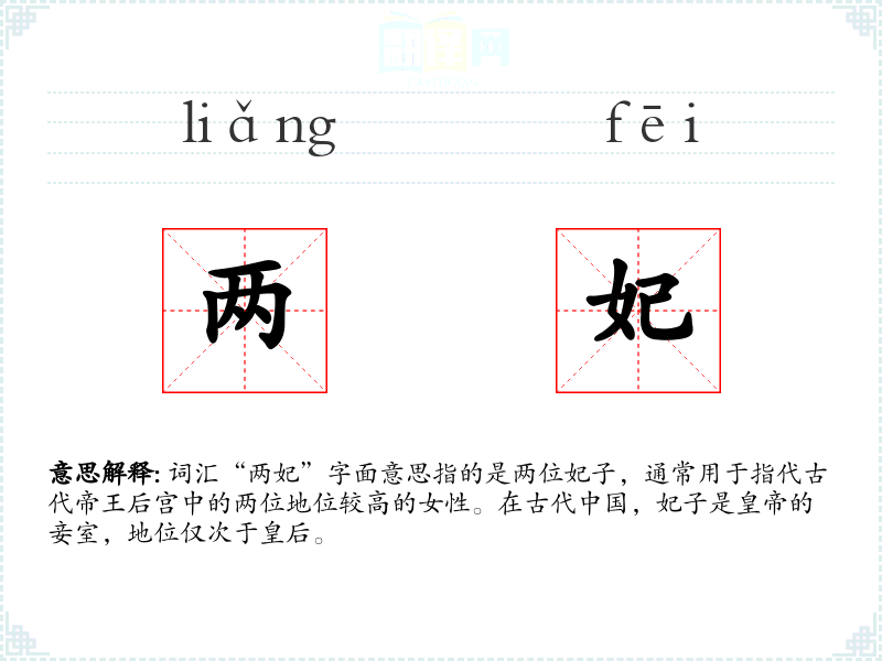 词汇“两妃”字面意思指的是两位妃子,通常用于指代古代帝王后宫中的两位地位较高的女性。在古代,妃子是的妾室,地位仅次于皇后。