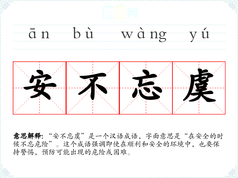 “安不忘虞”是一个汉语成语,字面意思是“在安全的时候不忘危险”。这个成语强调即使在顺利和安全的环境中,也要保持警惕,预防可能出现的危险或困难。