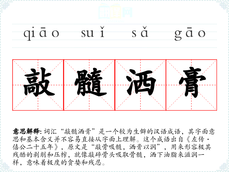 词汇“敲髓洒膏”是一个较为生僻的汉语成语,其字面意思和基本含义并不容易直接从字面上理解。这个成语出自《左传·僖公二十五年》,原文是“敲骨吸髓,洒膏以润”,用来形容极其残酷的剥削和压榨,就像敲碎骨头吸取骨髓,洒下油脂来滋润一样,意味着极度的贪婪和残忍。