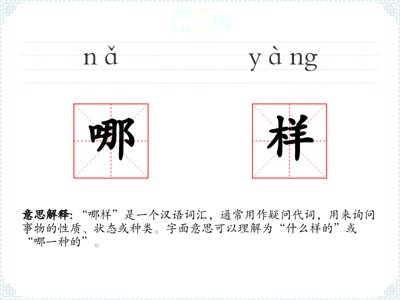 “哪样”是一个汉语词汇,通常用作疑问代词,用来询问事物的性质、状态或种类。字面意思可以理解为“什么样的”或“哪一种的”。