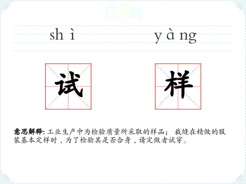 工业生产中为检验质量所采取的样品; 裁缝在精做的服装基本定样时﹐为了检验其是否合身﹐请定做者试穿。