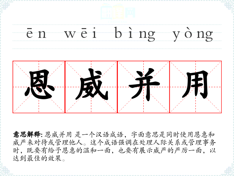 恩威并用 是一个汉语成语,字面意思是同时使用恩惠和威严来对待或管理他人。这个成语强调在处理人际关系或管理事务时,既要有给予恩惠的温和一面,也要有展示威严的严厉一面,以达到最佳的效果。