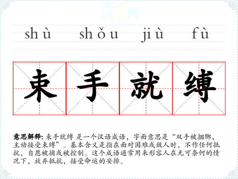 束手就缚 是一个汉语成语,字面意思是“双手被捆绑,主动接受束缚”。基本含义是指在面对困难或敌人时,不作任何抵抗,自愿被捕或被控制。这个成语通常用来形容人在无可奈何的情况下,放弃抵抗,接受命运的安排。