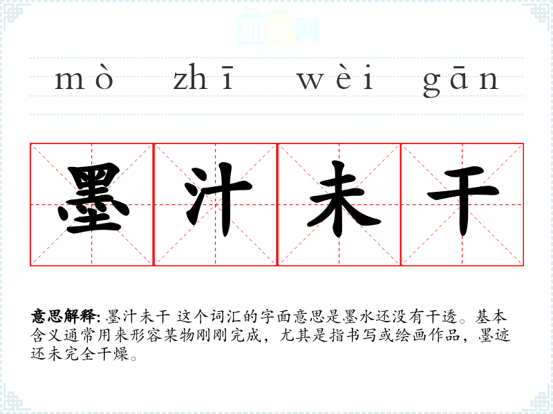 墨汁未干 这个词汇的字面意思是墨水还没有干透。基本含义通常用来形容某物刚刚完成,尤其是指书写或绘画作品,墨迹还未完全干燥。