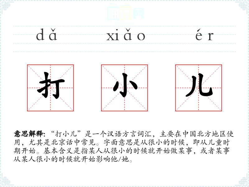 “打小儿”是一个汉语方言词汇,主要在**北方地区使用,尤其是北京话中常见。字面意思是从很小的时候,即从儿童时期开始。基本含义是指某人从很小的时候就开始做某事,或者某事从某人很小的时候就开始影响他/她。