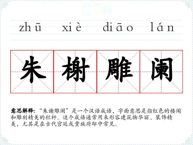 “朱谢雕阑”是一个汉语成语,字面意思是指红色的楼阁和雕刻精美的栏杆。这个成语通常用来形容建筑物华丽、装饰精美,尤其是在古代宫廷或贵族府邸中常见。