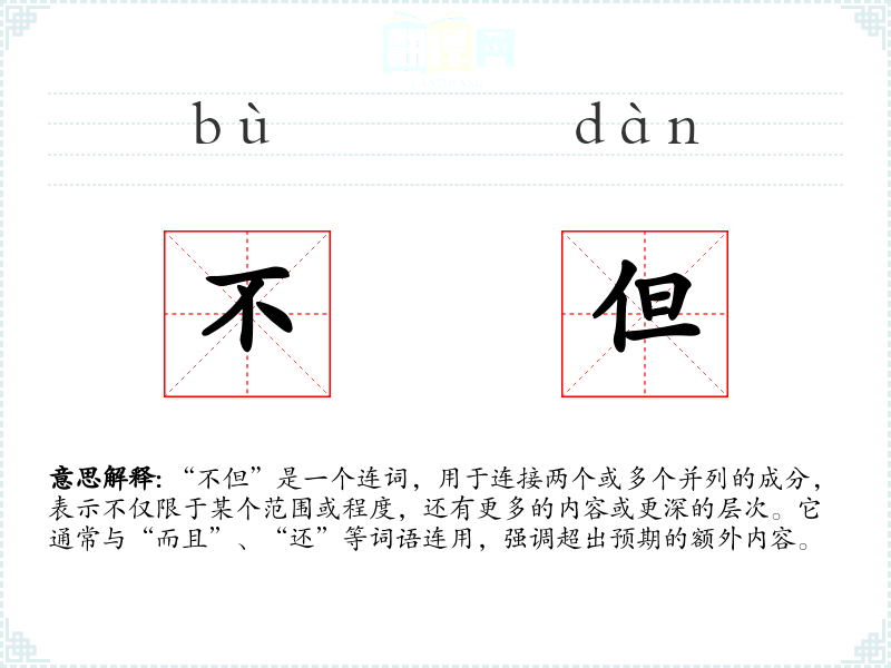 “不但”是一个连词,用于连接两个或多个并列的成分,表示不仅限于某个范围或程度,还有更多的内容或更深的层次。它通常与“而且”、“还”等词语连用,强调超出预期的额外内容。