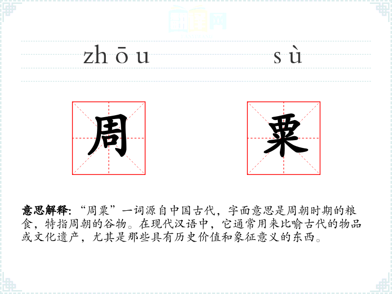 在文学作品中,“周粟”常被用来形容那些古老而珍贵的事物,如古籍、文物等。在口语中,它可能不太常用,但在专业领域,如历史学、考古学中,它可能会被用来指代特定的历史时期或文化产物。
