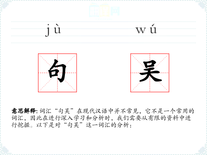 词汇“句吴”在现代汉语中并不常见,它不是一个常用的词汇,因此在进行深入学*和分析时,我们需要从有限的资料中进行挖掘。以下是对“句吴”这一词汇的分析: