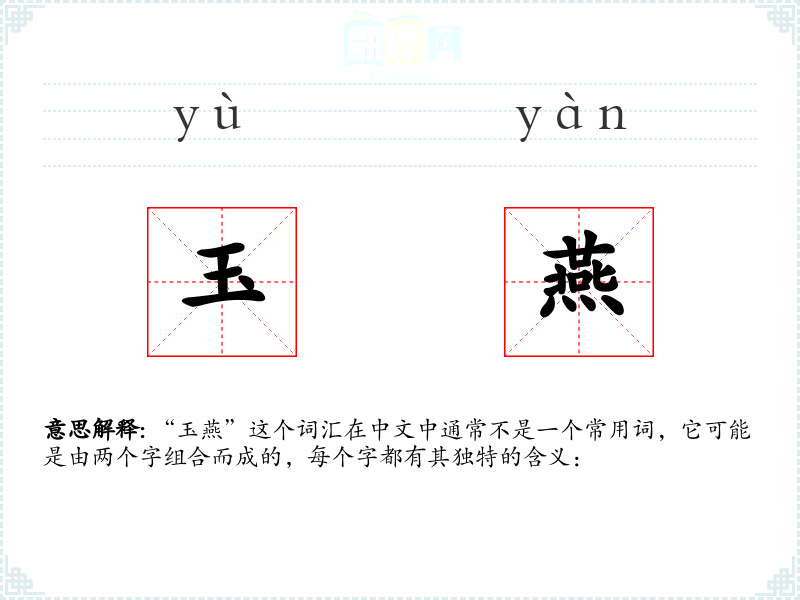 “玉燕”这个词汇在中文中通常不是一个常用词,它可能是由两个字组合而成的,每个字都有其独特的含义: