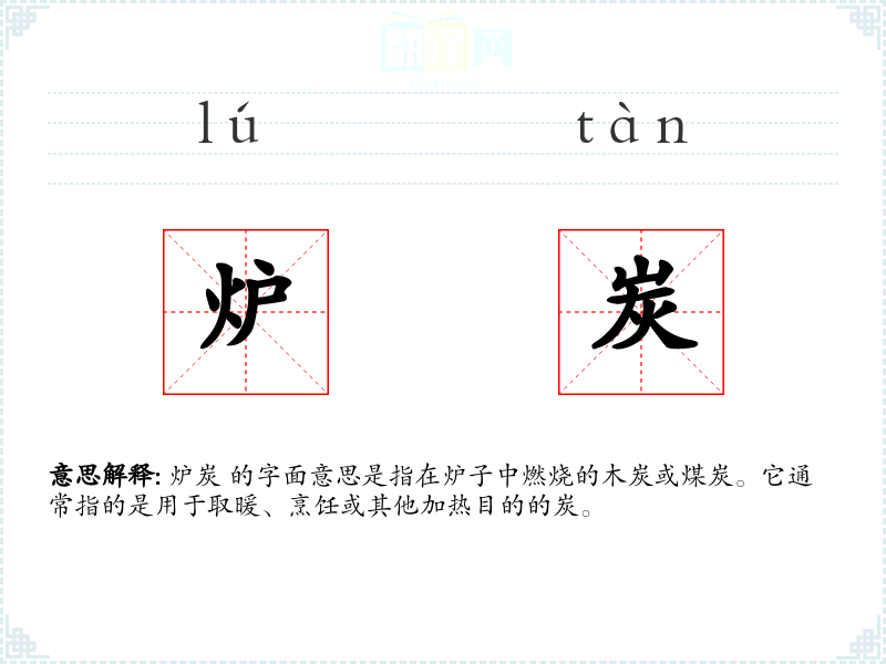 - 口语:在日常对话中,炉炭可能简单地指代用于加热的炭。例如,“我们需要更多的炉炭来保持房间温暖。”