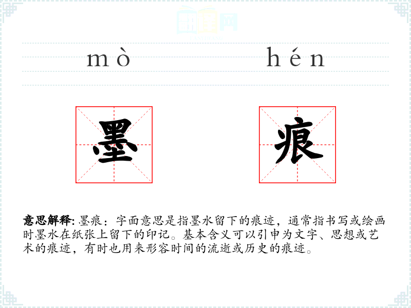 墨痕:字面意思是指墨水留下的痕迹,通常指书写或绘画时墨水在纸张上留下的印记。基本含义可以引申为文字、思想或艺术的痕迹,有时也用来形容时间的流逝或历史的痕迹。
