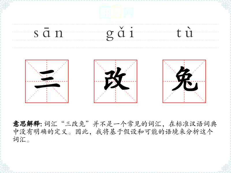 词汇“三改兔”并不是一个常见的词汇,在标准汉语词典中没有明确的定义。因此,我将基于假设和可能的语境来分析这个词汇。