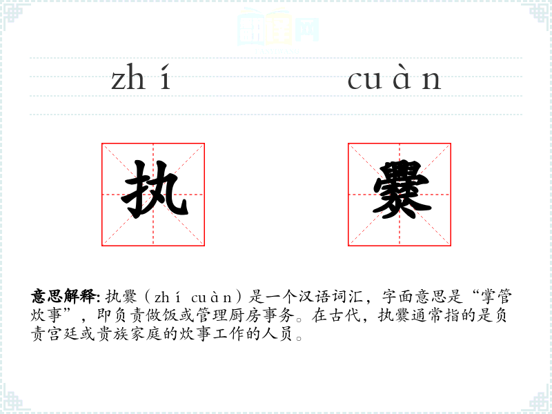 词源:执爨一词源于古代汉语,其中“执”意为掌管、负责,“爨”意为炊事、做饭。