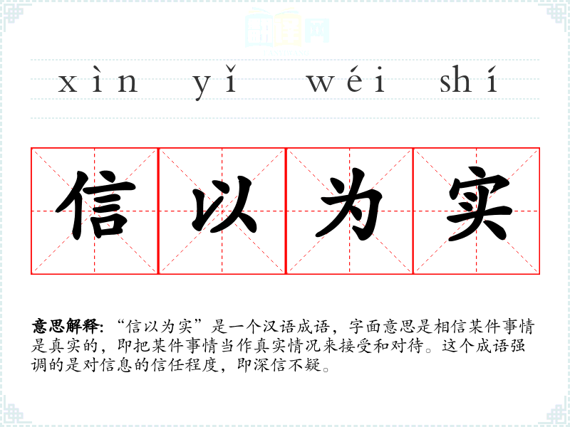 “信以为实”是一个汉语成语,字面意思是相信某件事情是真实的,即把某件事情当作真实情况来接受和对待。这个成语强调的是对信息的信任程度,即深信不疑。