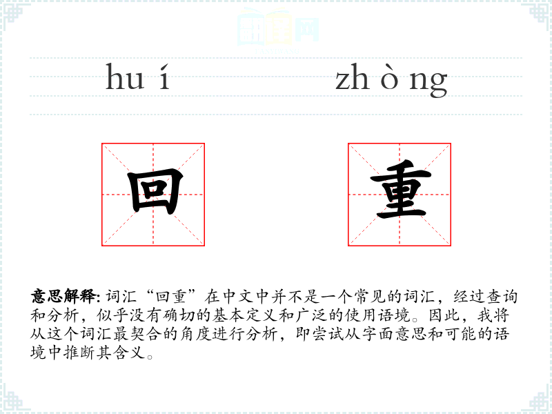 词汇“回重”在中文中并不是一个常见的词汇,经过查询和分析,似乎没有确切的基本定义和广泛的使用语境。因此,我将从这个词汇最契合的角度进行分析,即尝试从字面意思和可能的语境中推断其含义。