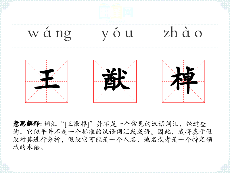 词汇“[王猷棹]”并不是一个常见的汉语词汇,经过查询,它似乎并不是一个标准的汉语词汇或成语。因此,我将基于假设对其进行分析,假设它可能是一个人名、地名或者是一个特定领域的术语。