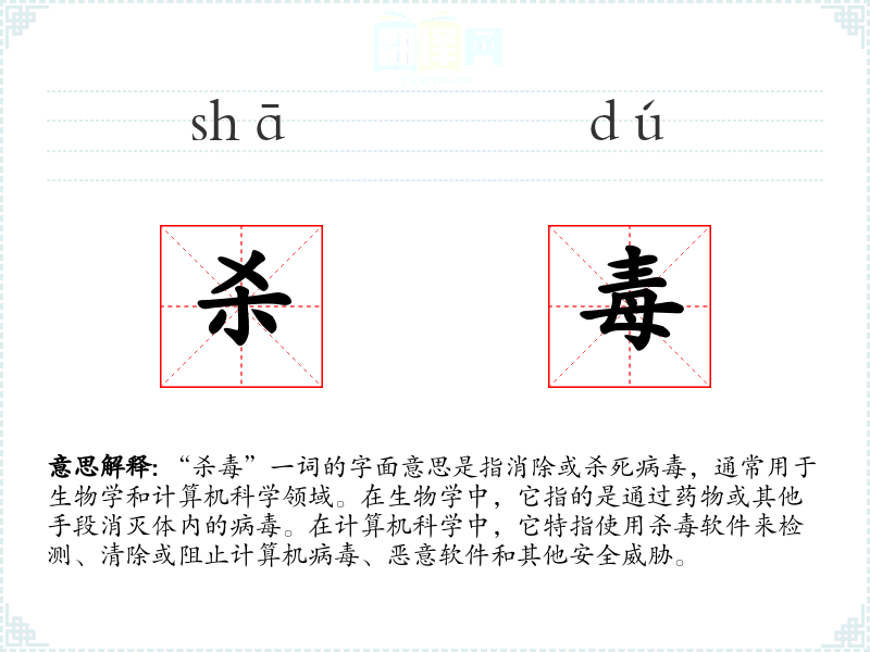 - 专业领域:在IT和网络安全领域,“杀毒”是一个专业术语,涉及病毒检测、清除和预防。