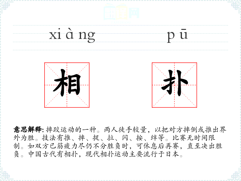 1.摔跤运动的一种。两人徒手较量,以把对方摔倒或推出界外为胜。技法有推、摔、捉、拉、闪、按、绊等。比赛无时间限制。如双方已筋疲力尽仍不分胜负时,可休息后再赛,直至决出胜负。中国古代有相扑,现代相扑运动主要流行于日本。