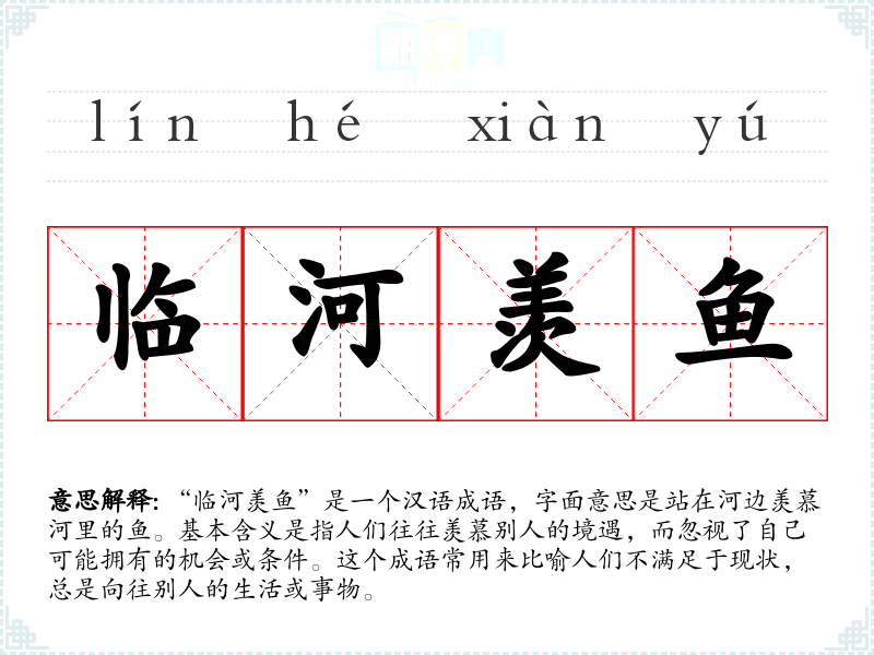 “临河羡鱼”这个成语出自《淮南子·说山训》:“临河而羡鱼,不如归家织网。”原意是说,站在河边羡慕鱼,不如回家织网捕鱼。后来逐渐演变成比喻人们不满足于现状,总是向往别人的生活或事物。