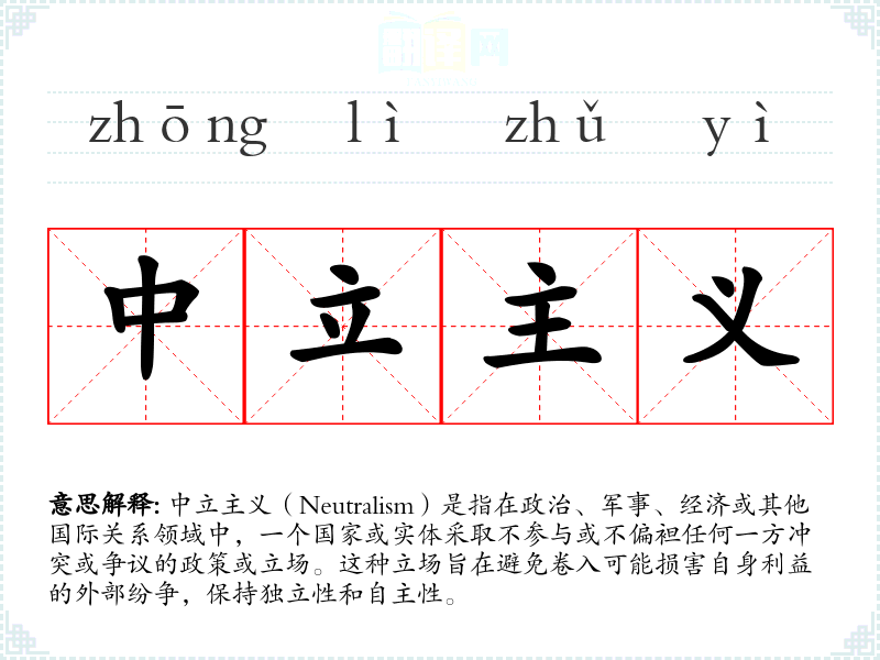 - 专业领域:在国际关系学中,中立主义是一个重要的概念,用于分析国家的外交政策和国际战略。