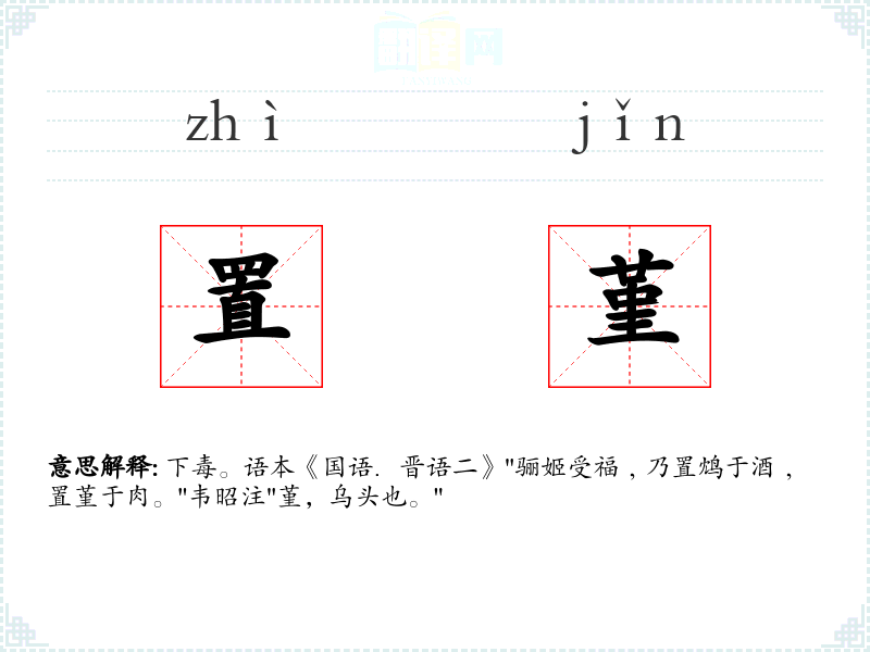 下毒。语本《国语.晋语二》"骊姬受福﹐乃置鸩于酒﹐置堇于肉。"韦昭注"堇,乌头也。"