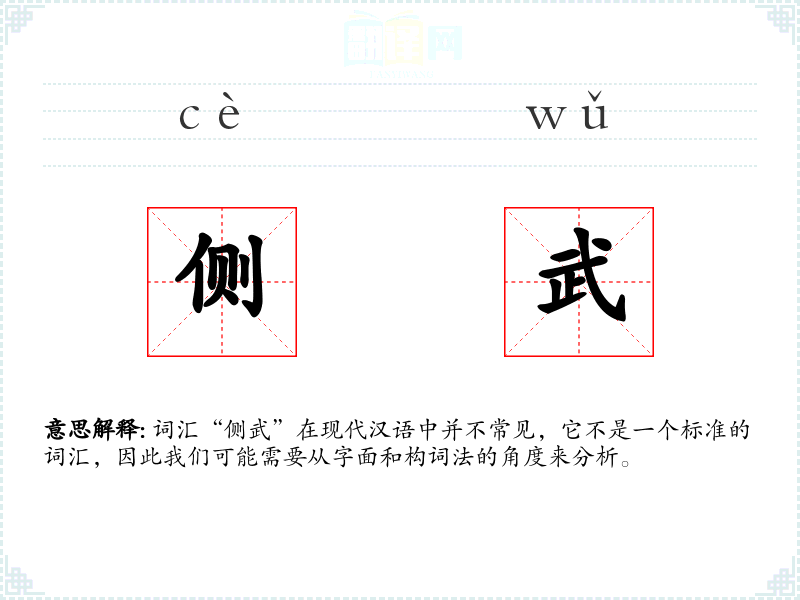 词汇“侧武”在现代汉语中并不常见,它不是一个标准的词汇,因此我们可能需要从字面和构词法的角度来分析。