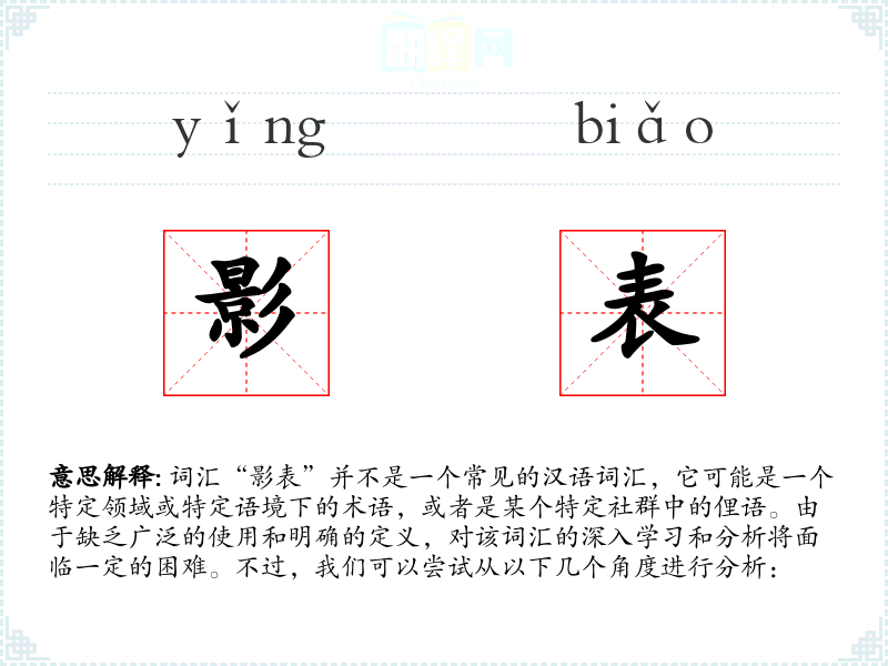 由于“影表”不是一个标准词汇,我们无法给出一个确切的字面意思和基本含义。它可能是由“影”和“表”两个字组合而成的,其中“影”通常指影子、影像,而“表”可以指表面、表达等。因此,“影表”可能指的是某种形式的影像表达或表面现象。