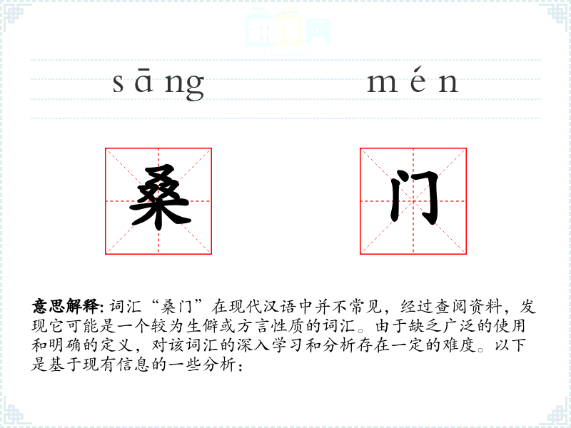 综上所述,对于“桑门”这一词汇的深入学习和分析存在较大的困难,需要更多的上下文信息和专业资料支持。在语言学习中,应注重对常用词汇的掌握和理解,同时对于生僻词汇保持好奇和探索的态度。