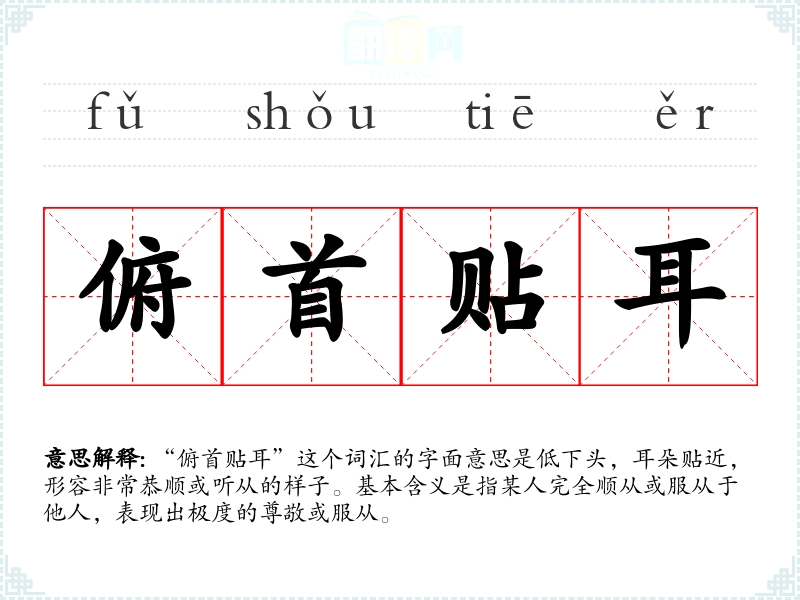 “俯首贴耳”这个词汇的字面意思是低下头,耳朵贴近,形容非常恭顺或听从的样子。基本含义是指某人完全顺从或服从于他人,表现出极度的尊敬或服从。