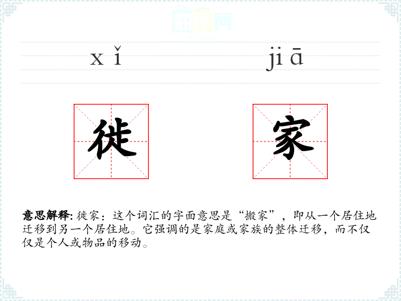 徙家:这个词汇的字面意思是“搬家”,即从一个居住地迁移到另一个居住地。它强调的是家庭或家族的整体迁移,而不仅仅是个人或物品的移动。