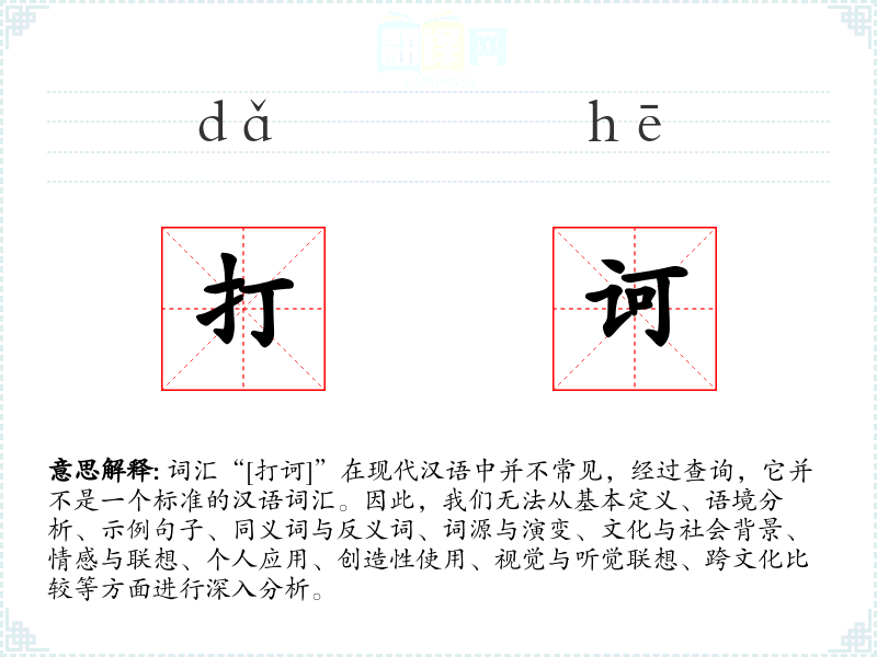由于“[打诃]”不是一个已知的词汇,上述分析都是基于假设的。在实际的语言学习和研究中,我们需要有确切的词汇信息和语料库支持,才能进行准确的分析和讨论。