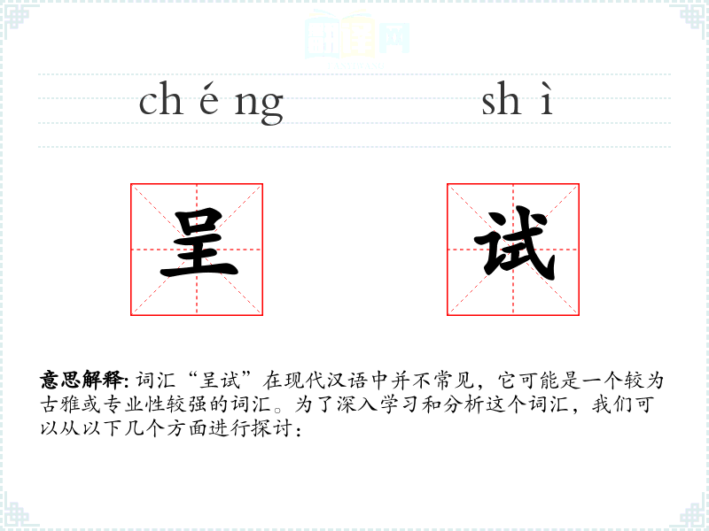 词汇“呈试”在现代汉语中并不常见,它可能是一个较为古雅或专业性较强的词汇。为了深入学*和分析这个词汇,我们可以从以下几个方面进行探讨: