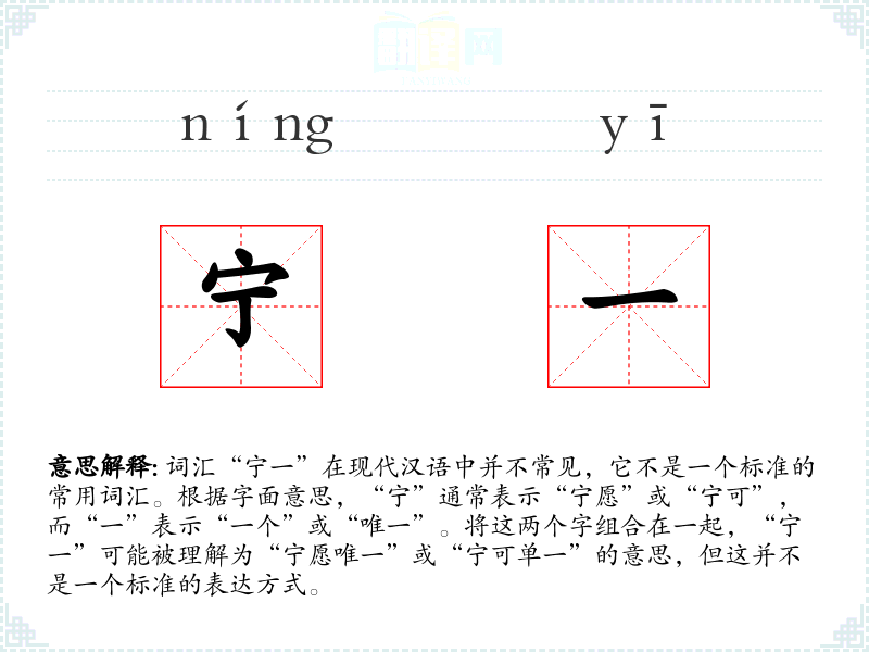 同义词与反义词: 由于“宁一”不是一个常用词汇,很难找到直接的同义词和反义词。如果将其理解为“宁愿唯一”,那么同义词可能是“独一”或“唯一”,反义词可能是“多样”或“多重”。