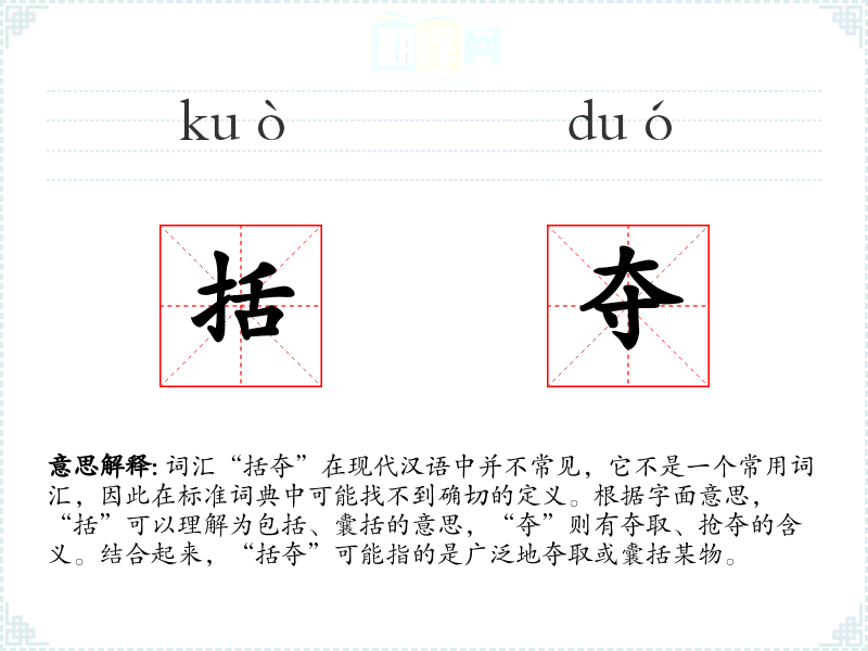 词汇“括夺”在现代汉语中并不常见,它不是一个常用词汇,因此在标准词典中可能找不到确切的定义。根据字面意思,“括”可以理解为包括、囊括的意思,“夺”则有夺取、抢夺的含义。结合起来,“括夺”可能指的是广泛地夺取或囊括某物。