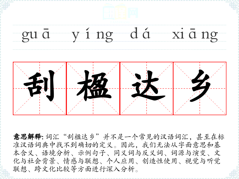 词汇“刮楹达乡”并不是一个常见的汉语词汇,甚至在标准汉语词典中找不到确切的定义。因此,我们无法从字面意思和基本含义、语境分析、示例句子、同义词与反义词、词源与演变、文化与社会背景、情感与联想、个人应用、创造性使用、视觉与听觉联想、跨文化比较等方面进行深入分析。