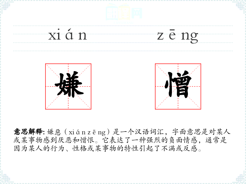 嫌惡(xián zēng)是一个汉语词汇,字面意思是对某人或某事物感到厌恶和憎恨。它表达了一种强烈的负面情感,通常是因为某人的行为、性格或某事物的特性引起了不满或反感。