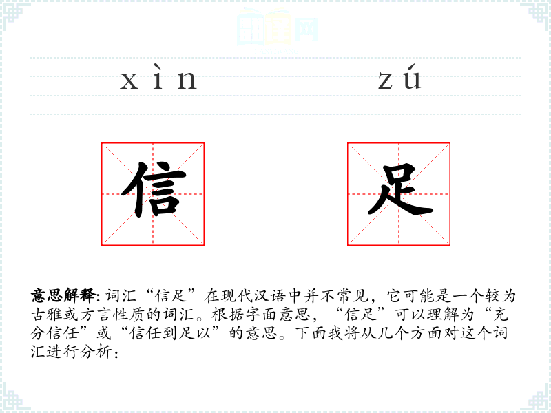 词汇“信足”在现代汉语中并不常见,它可能是一个较为古雅或方言性质的词汇。根据字面意思,“信足”可以理解为“充分信任”或“信任到足以”的意思。下面我将从几个方面对这个词汇进行分析:
