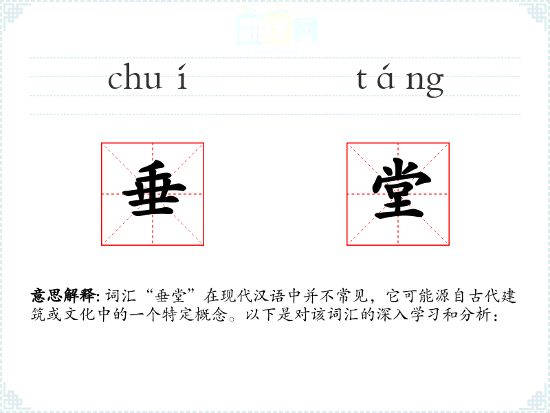 词汇“垂堂”在现代汉语中并不常见,它可能源自古代建筑或文化中的一个特定概念。以下是对该词汇的深入学*和分析: