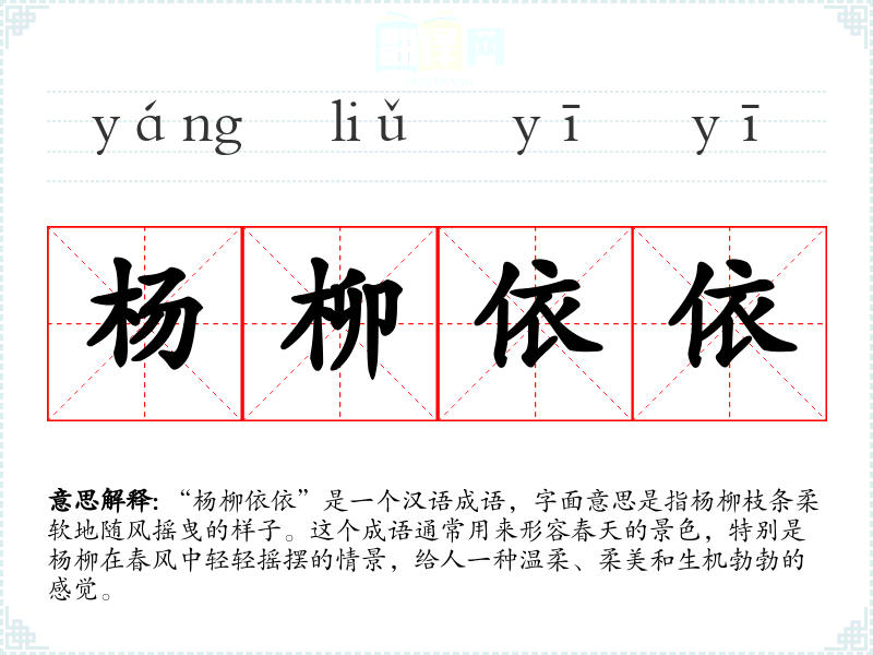 “杨柳依依”是一个汉语成语,字面意思是指杨柳枝条柔软地随风摇曳的样子。这个成语通常用来形容春天的景色,特别是杨柳在春风中轻轻摇摆的情景,给人一种温柔、柔美和生机勃勃的感觉。