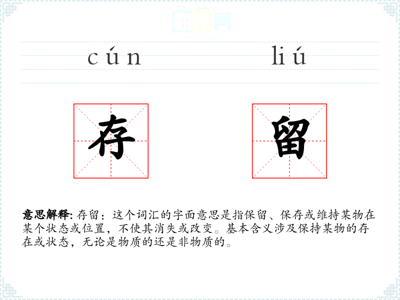 存留:这个词汇的字面意思是指保留、保存或维持某物在某个状态或位置,不使其消失或改变。基本含义涉及保持某物的存在或状态,无论是物质的还是非物质的。