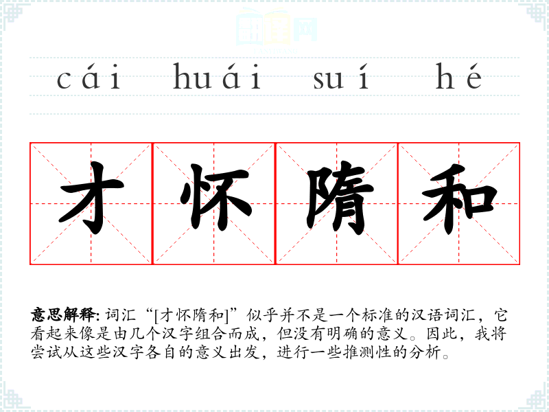 词汇“[才怀隋和]”似乎并不是一个标准的汉语词汇,它看起来像是由几个汉字组合而成,但没有明确的意义。因此,我将尝试从这些汉字各自的意义出发,进行一些推测性的分析。